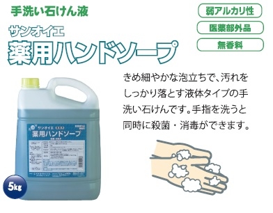 業務用として求められるスペックを全て備えています。(殺菌剤配合、泡になる液体タイプ、無香料で色付き)