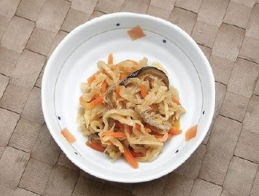 切干大根、人参、油揚げ、椎茸の4種類の具材をじっくりと煮あげたお惣菜です。