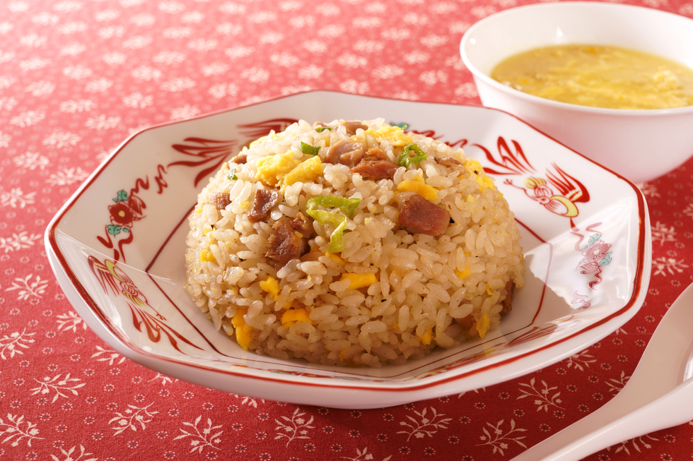 焼豚と野菜(たまねぎ、ねぎ)、スクランブルエッグを具材に使用した炒飯です。