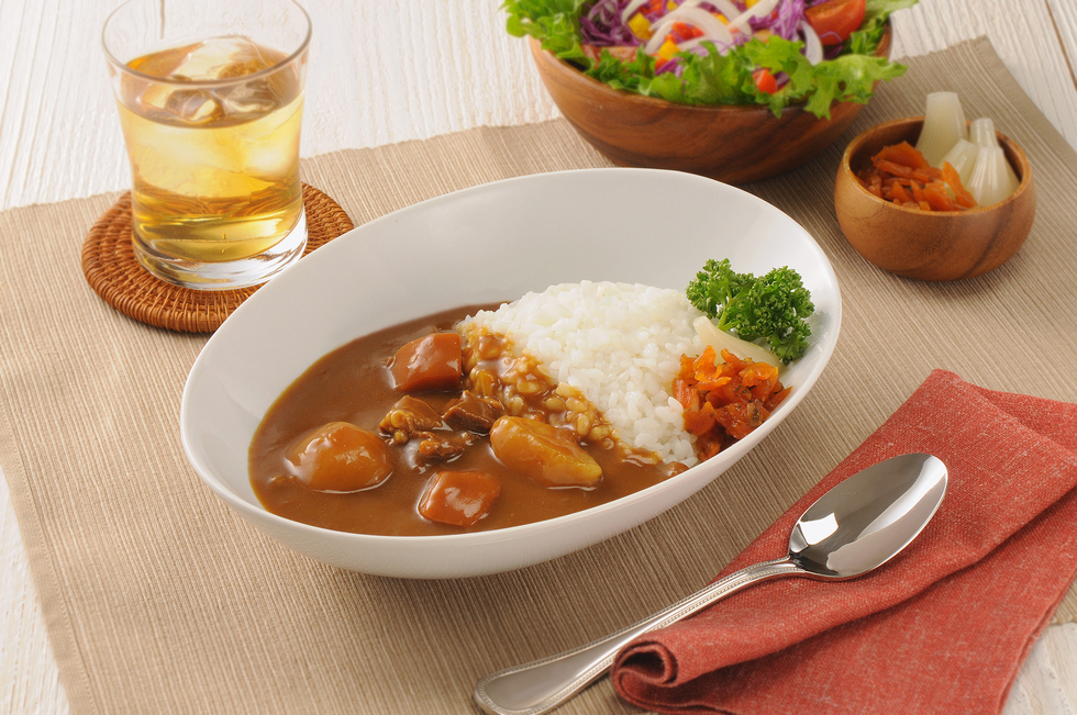 食べやすくくせの無いカレーソースに、野菜(じゃがいも・にんじん)をごろごろ入れて、シンプルに仕上げたビーフカレーです。