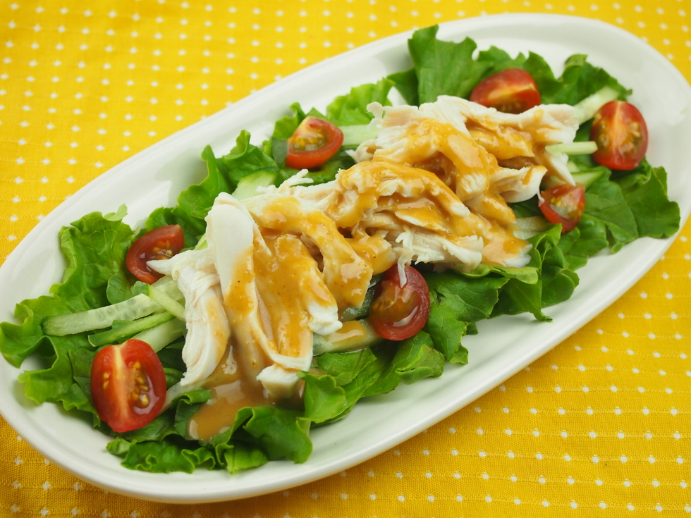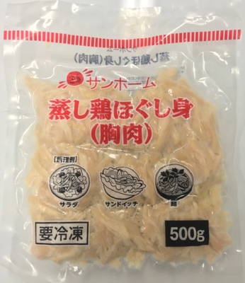 鶏の胸肉に薄味をつけて蒸し、丹念に手でほぐしました。