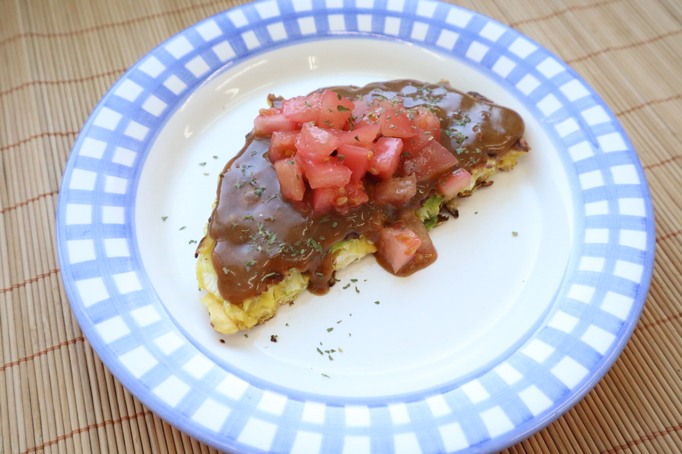 たっぷりトマトととろとろチーズカレーソースのお好み焼き